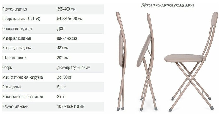Стул складной "Ника 1" до 100кг, светло-серый, сид.39,5*40см, сталь/винилискожа, h=48см ССН1/2, Nika