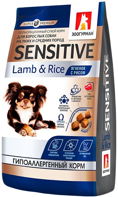Корм сухой Зоогурман Sensitive для взрослых собак мелких и средних пород, ягненок с рисом, 1,2 кг