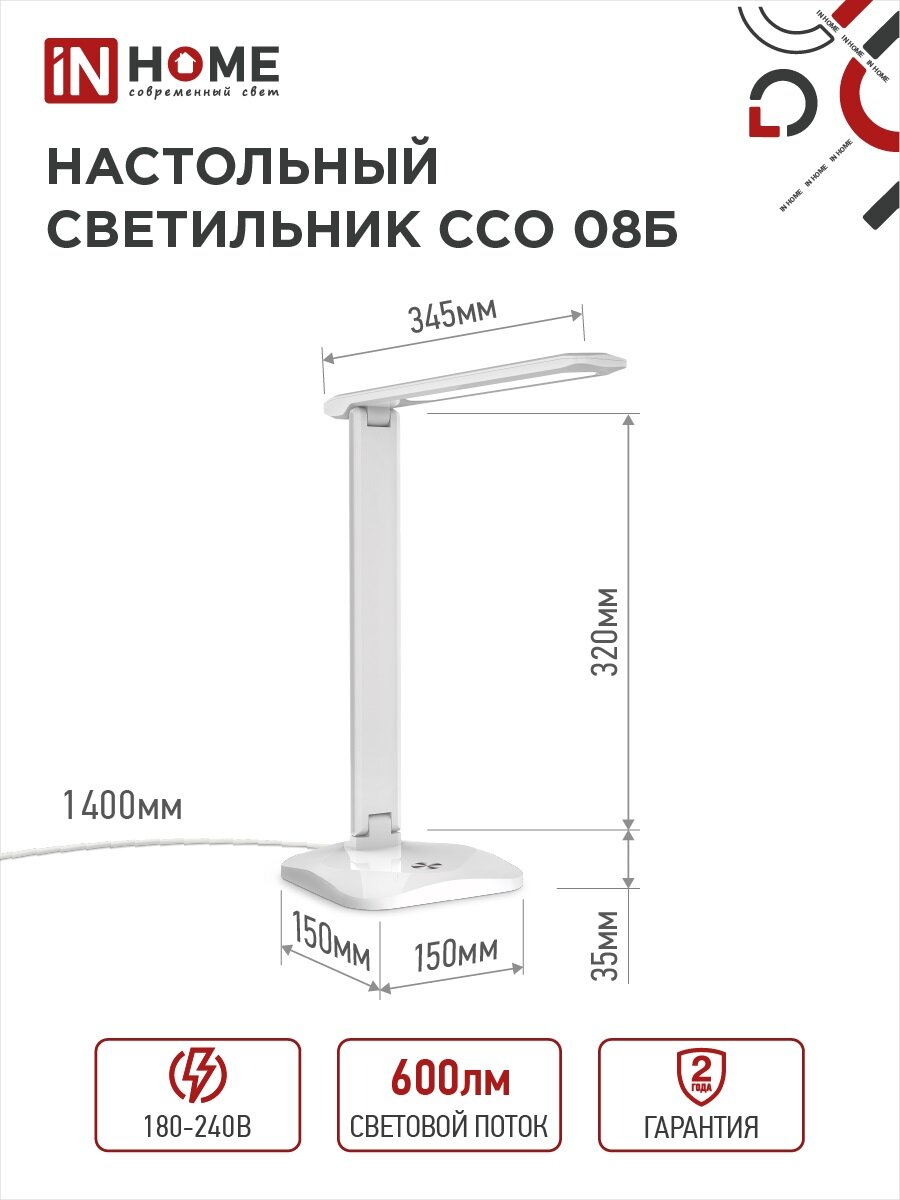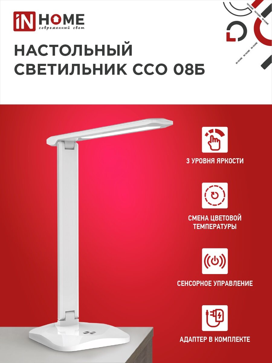 Настольная лампа Лампа настольная светодиодная, светильник для школьника IN HOME SIMPLE ССО-08Б 12Вт 600Лм/Белый