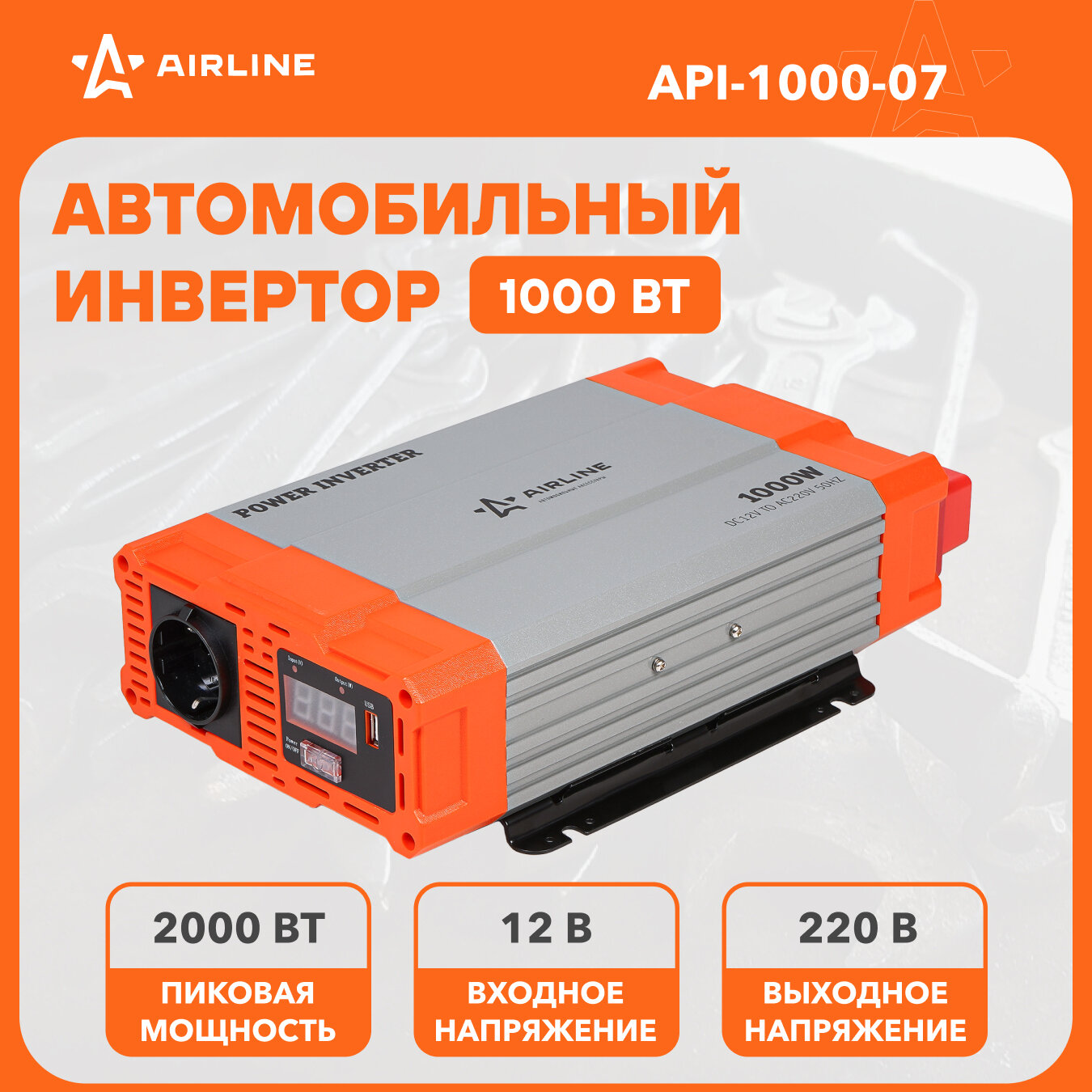 Автомобильный инвертор Преобразователь напряжения А/М 12В в 220В Airline API-1000-07, 1000Вт