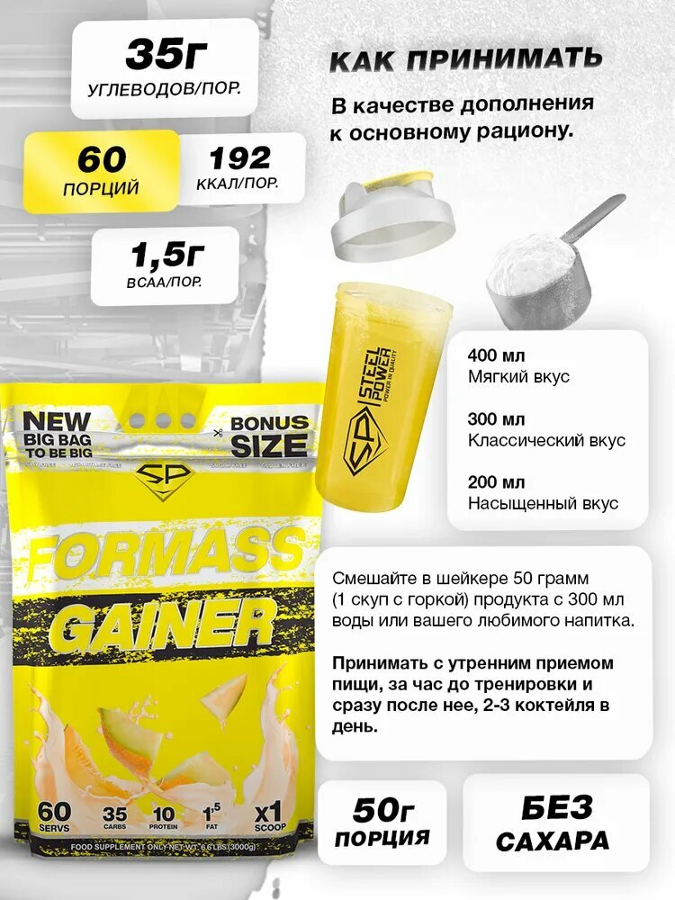 Гейнер STEELPOWER для набора мышечной массы FORMASS GAINER, 1500 грамм, со вкусом Сладкая Дыня