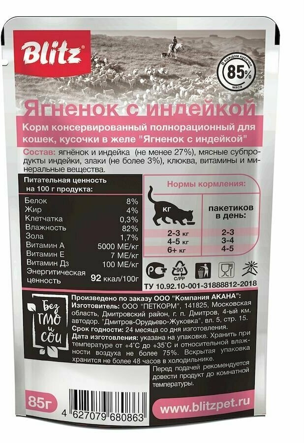 Корм для кошек BLITZ Консервы д/кошек Ягненок с Индейкой в желе пауч 85гр 12шт