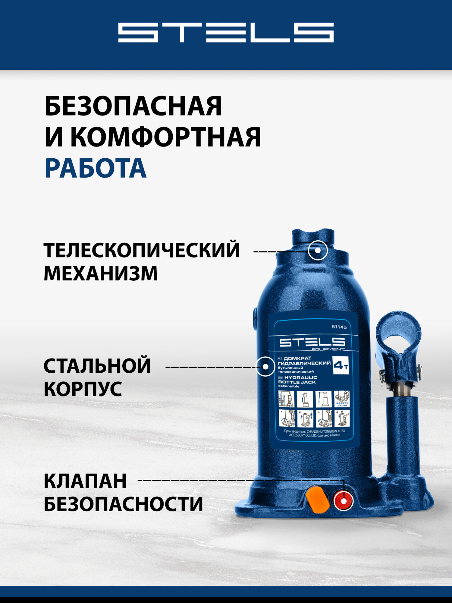Домкрат бутылочный гидравлический Stels 51145 (4 т) синий