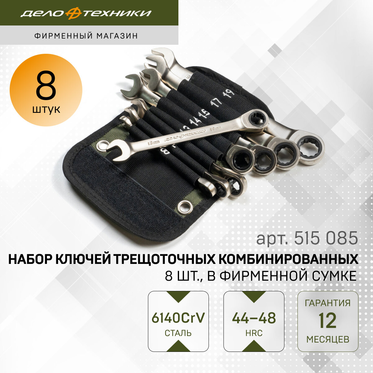 Дело техники 515085 Набор ключей трещоточных комбинированных 8 шт, (8, 10, 12, 13, 14, 15, 17, 19 мм), в фирменной сумке