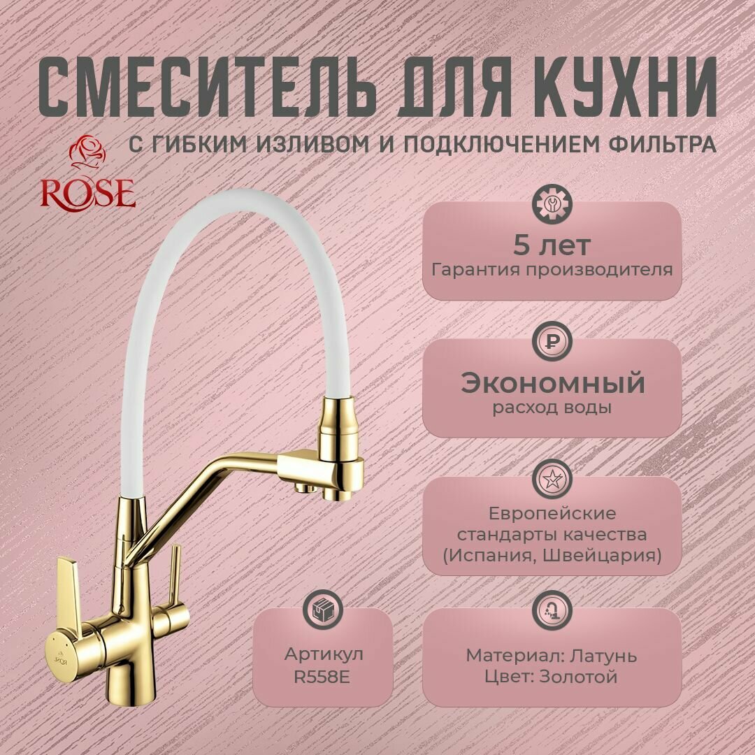 Смеситель Смесители для кухни с гибким изливом и подключением фильтра ROSE R558Е (латунь, цвет золото)