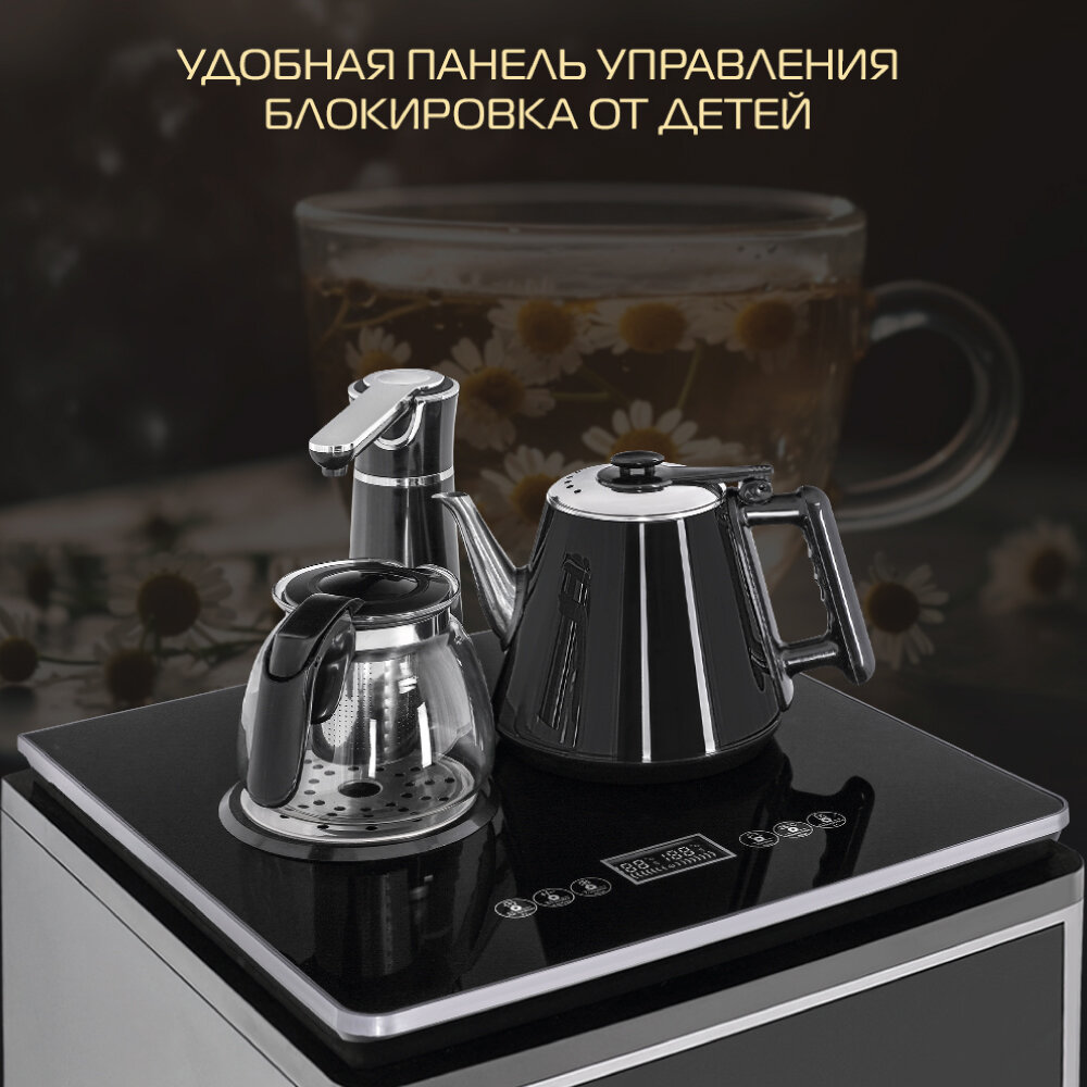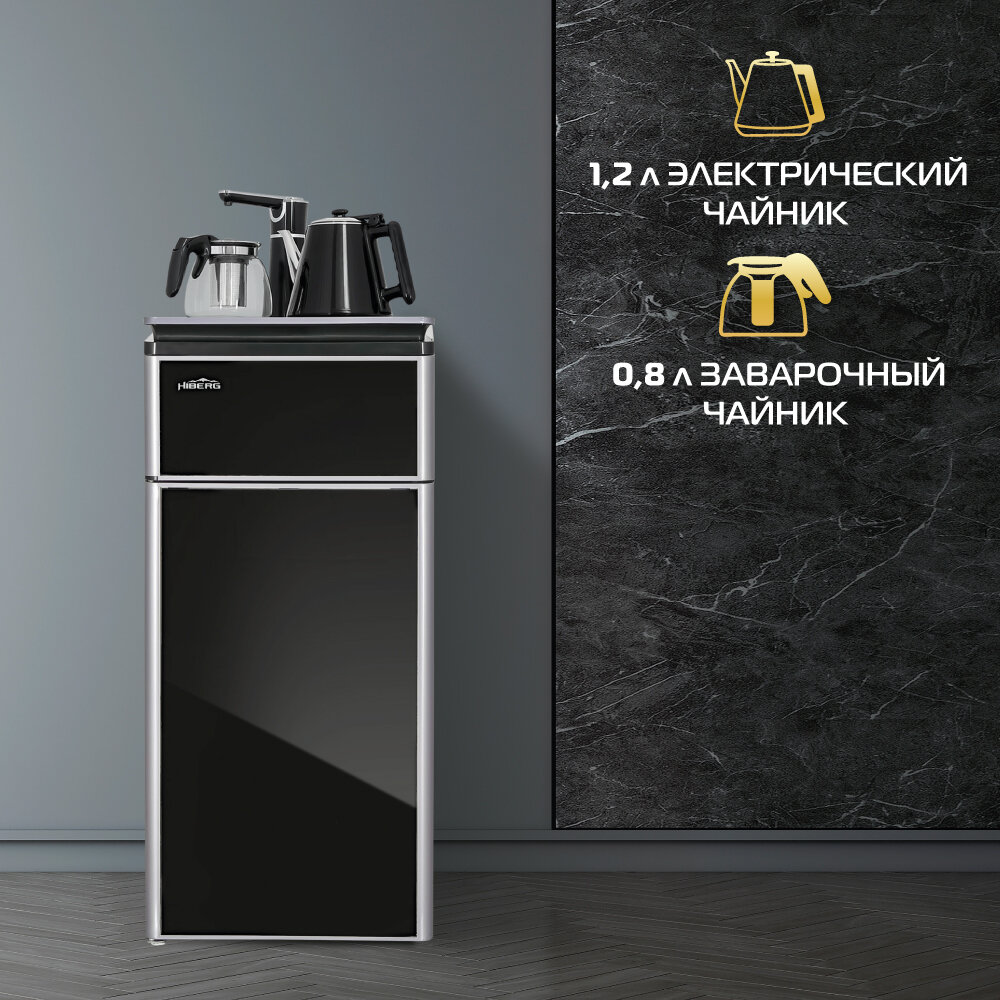 Кулер для воды HIBERG F81 FGB напольный, нижняя загрузка, электрочайник, черное стекло