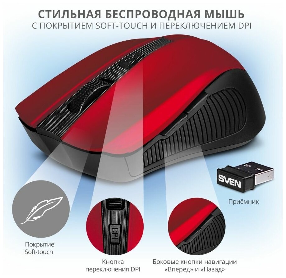 Мышь Wireless Sven RX-350W SV-019587 красная, 5+1кл. 600-1400DPI, SoftTouch