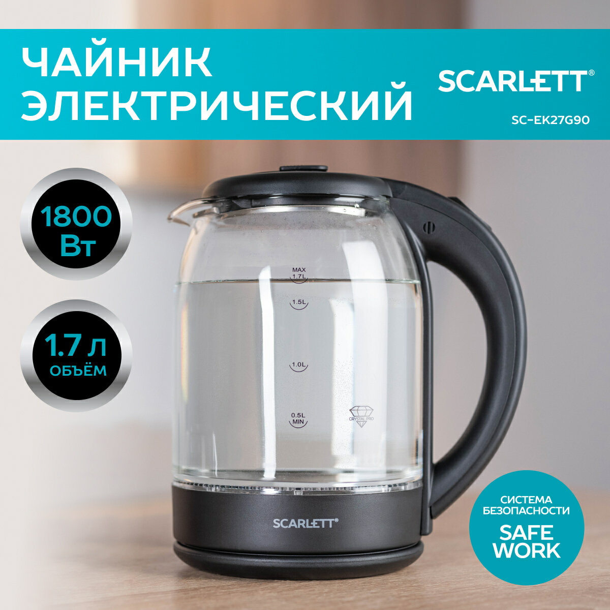 Чайник на подставке стеклянный SC-EK27G90, 1800Вт, 1.7л