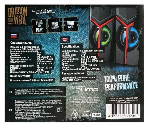 Колонки 2.0 Qumo TRON AS007, 10 ВТ, объемное звучание, RGB подсветка, USB+Jack 3,5мм, Black
