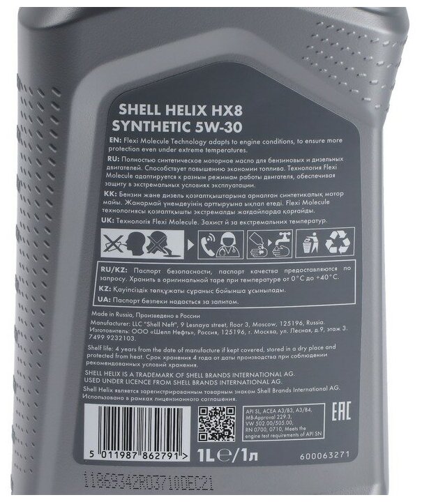 Синтетическое моторное масло SHELL Helix HX8 Synthetic 5W-30, 1 л, 1 кг