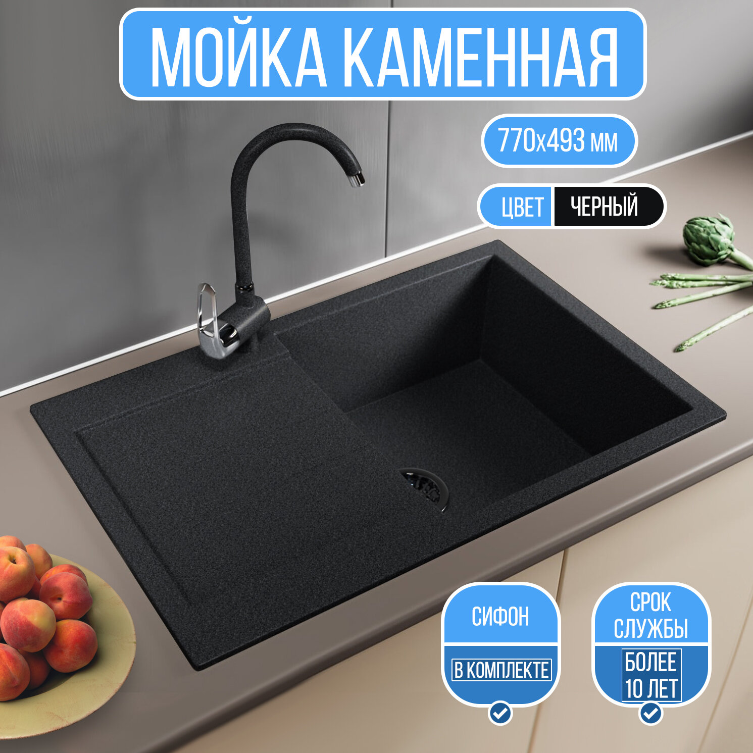 Кухонная мойка мойка для кухни из искусственного камня прямоугольная с крылом (77x49,3), черная