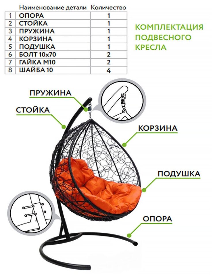 Подвесное кресло «капля» ротанг чёрное/оранжевая