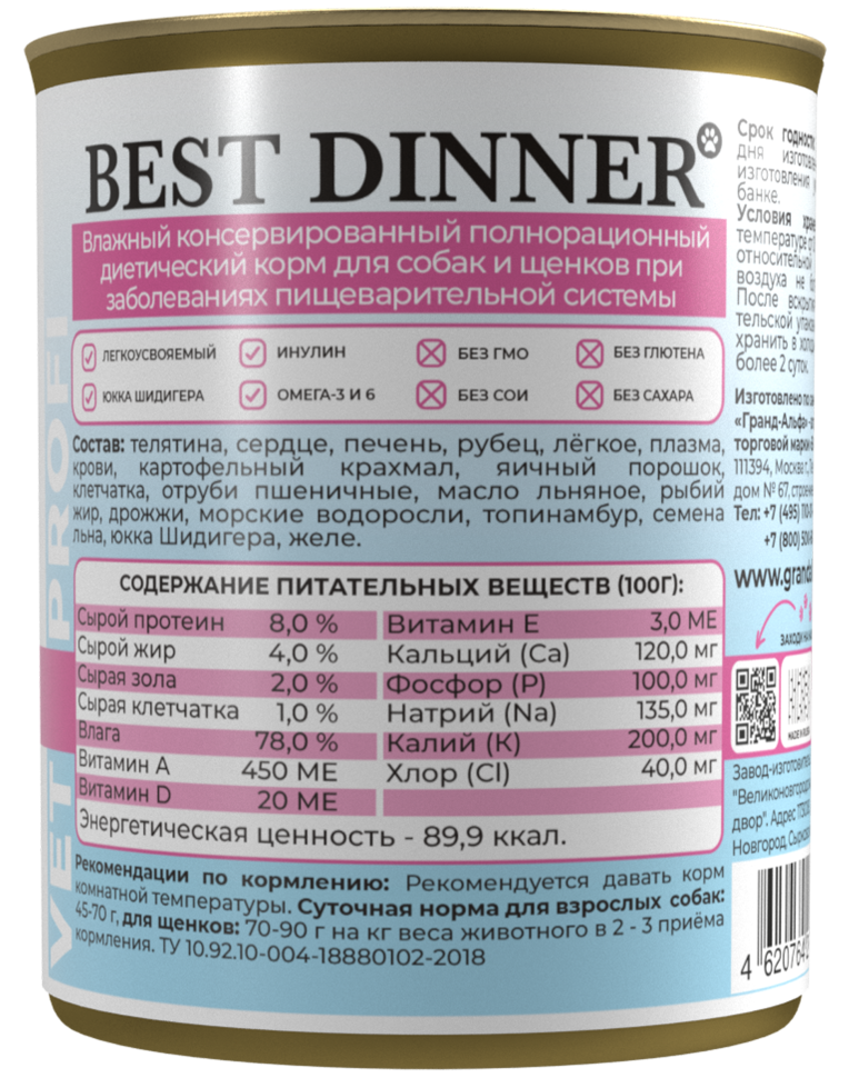 Best Dinner Vet Profi Gastro Intestinal Exclusive 12шт по 340г телятина с потрошками консервы для собак