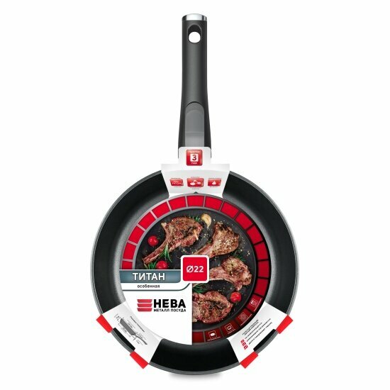 Сковорода 22 см Нева Металл Посуда Титан 9022, без крышки, со съемной ручкой, с толстым дном и с антипригарным покрытием