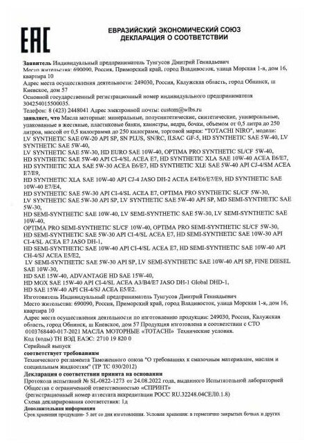 TOTACHI NIRO LV 5W30 SP/GF-5 синтетика 4л (1/4)