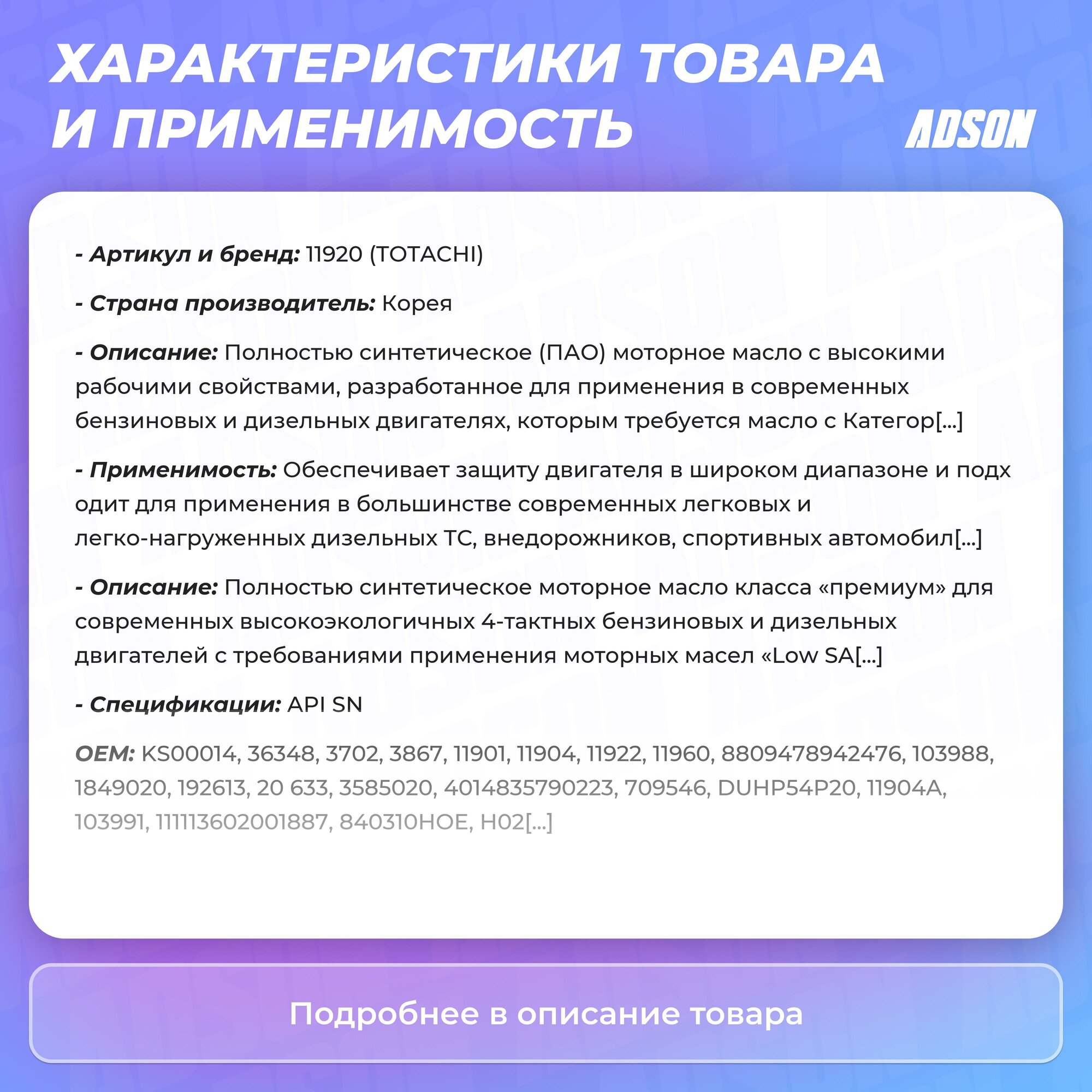 Масло Моторное TOTACHI арт. 11905 3 672 ₽ Подробнее
