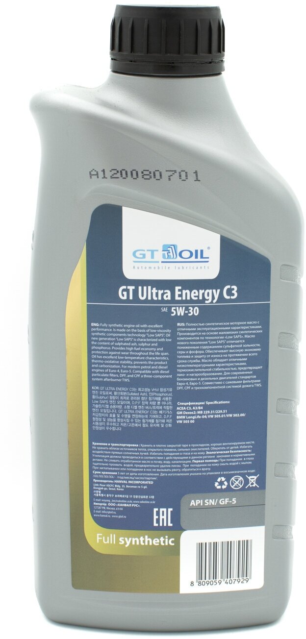 Масло моторное GT Ultra Energy C3, SAE 5w30, API SM,SN/CF, 1 л 8809059407929 GT OIL