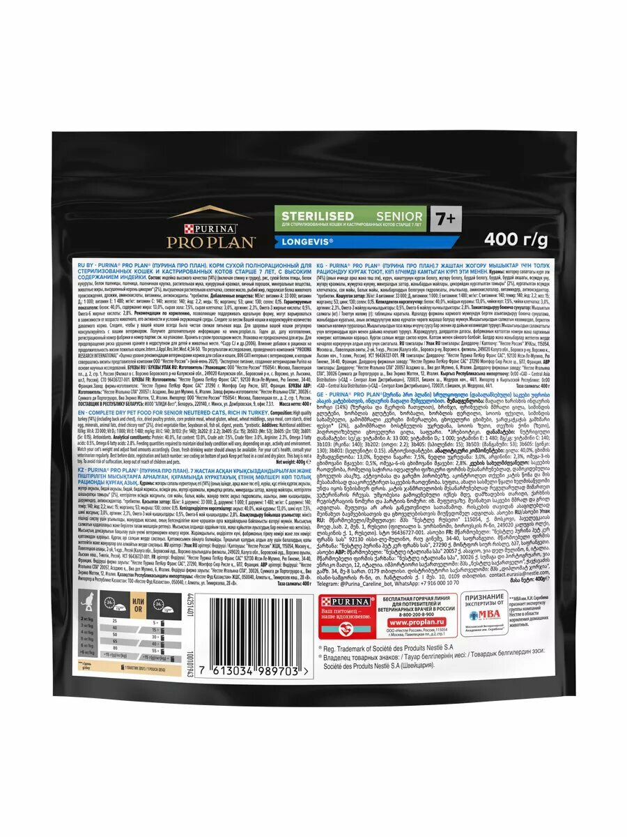 Сухой корм PRO PLAN® Sterilised Senior LONGEVIS® для стерилизованных кошек старше 7 лет, с высоким содержанием индейки 400 г
