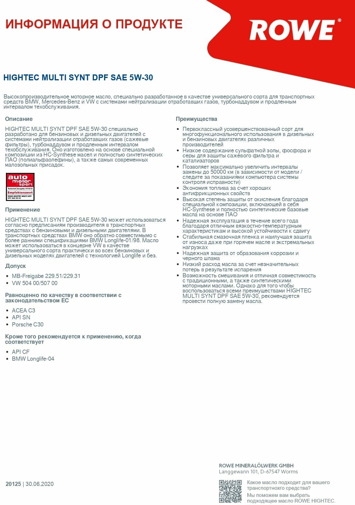 20125-0040-99 масло моторное hightec multi synt dpf 5w-30 (4л) Rowe 20125004099 Rowe 20125004099