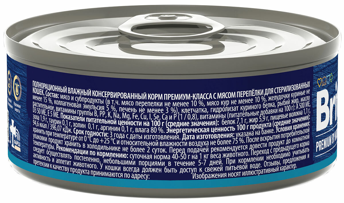 Корм для кошек Brit: Premium by Nature, Консервы с мясом перепёлки, для стерилизованных кошек, 100 гр.