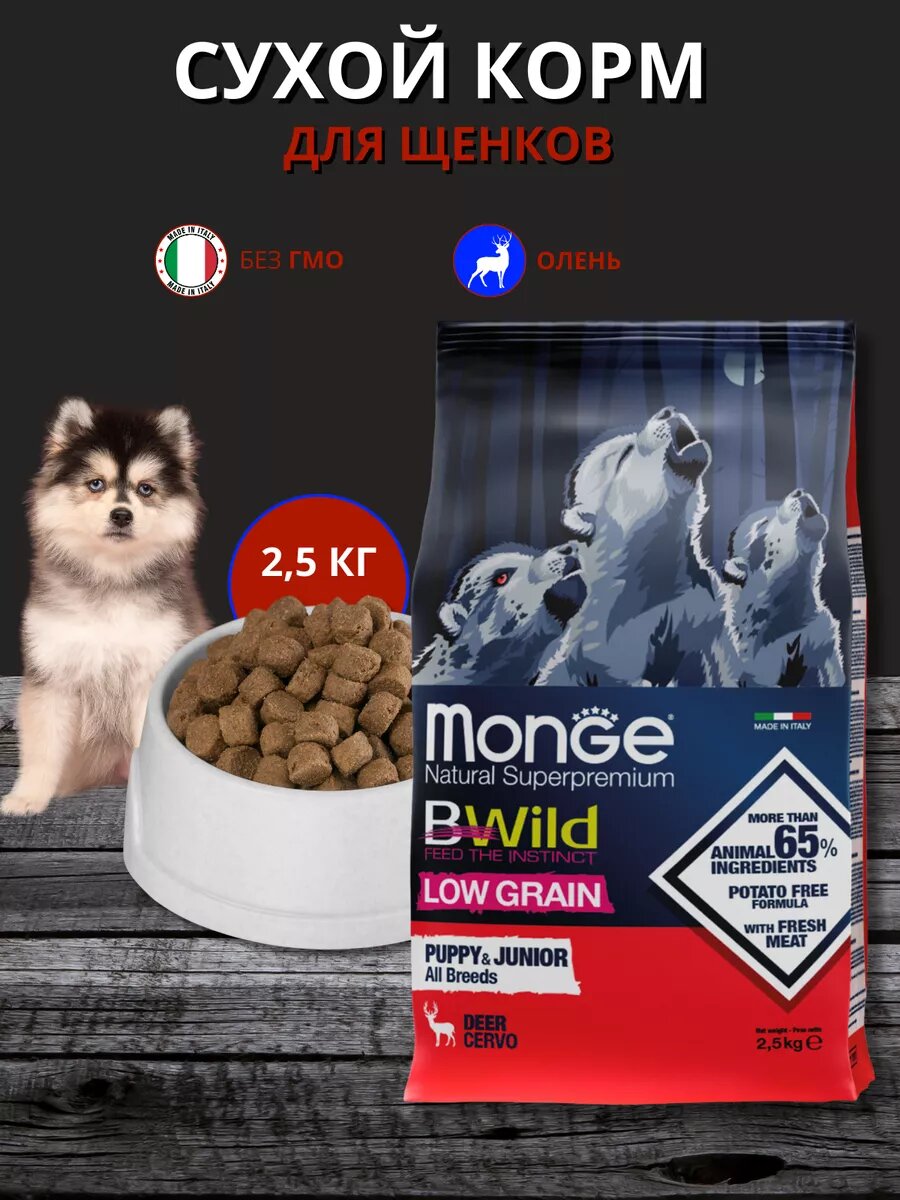 Корм для собак Сухой корм для щенков Monge, низкозерновой, из мяса оленя 2,5 кг