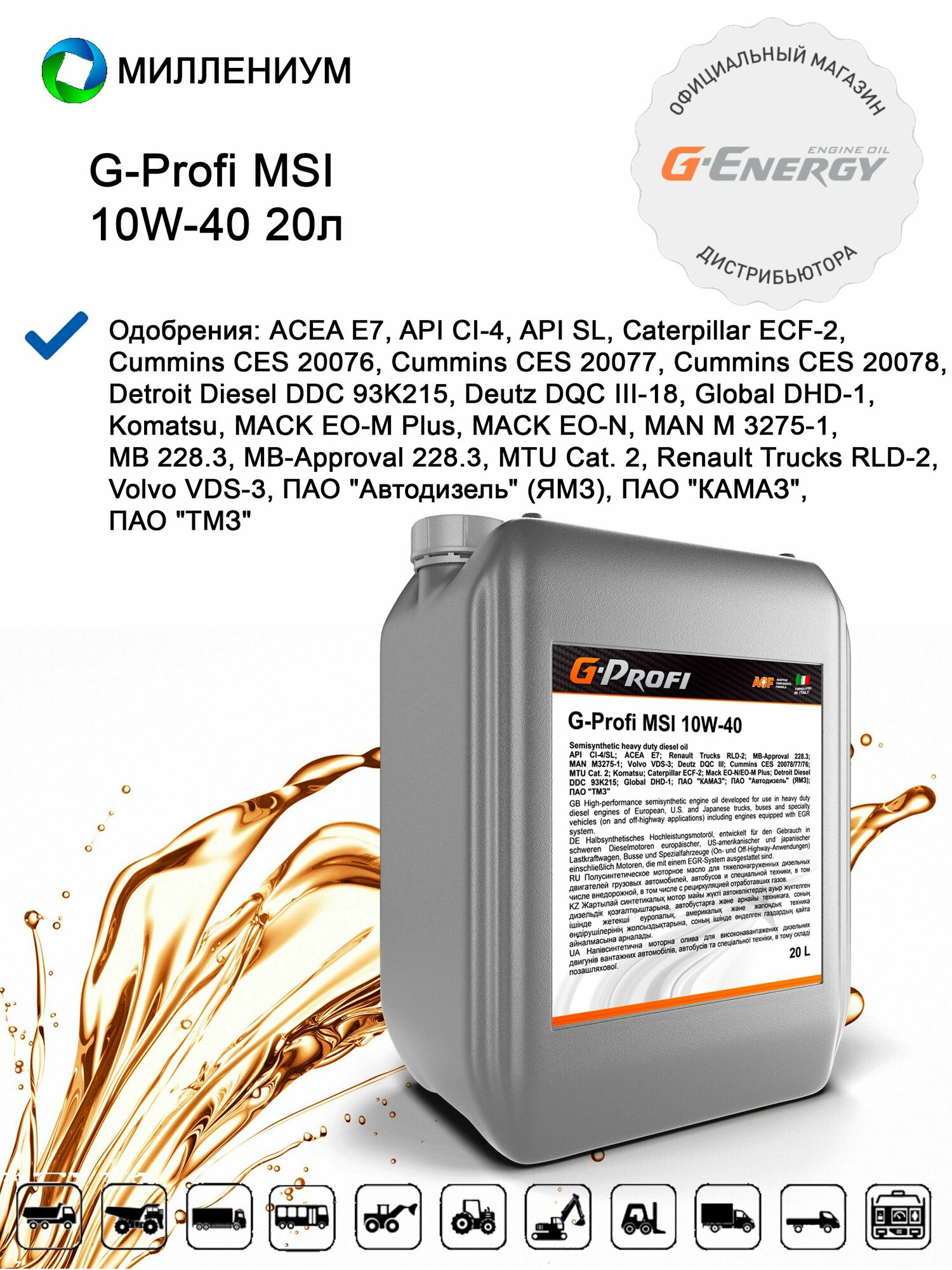 Масло моторное п/синтетическое G-Profi MSI 10W40, API CI-4/SL, ACEA E7, A3/B4, 20л 6 939 ₽ Подробнее