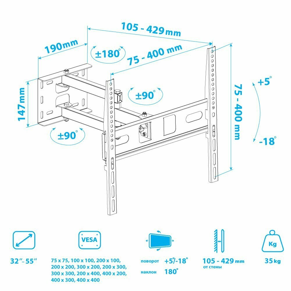 | Крепление VESA | 300x200 мм / 300x300 мм / 300x400 мм / 400x200 мм / 400x300 мм / 400x400 мм / 500x400 мм / 600x400 мм |