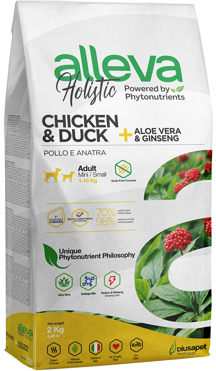 ALLEVA HOLISTIC Корм сухой для взрослых собак мелких пород с курицей и уткой, алое вера и женьшенем 2 кг