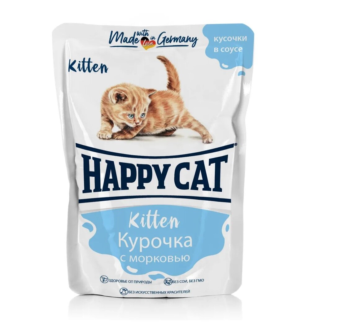 Корм для кошек Паучи Happy Cat для котят, с курочкой и морковью, кусочки в соусе 24шт х 85г