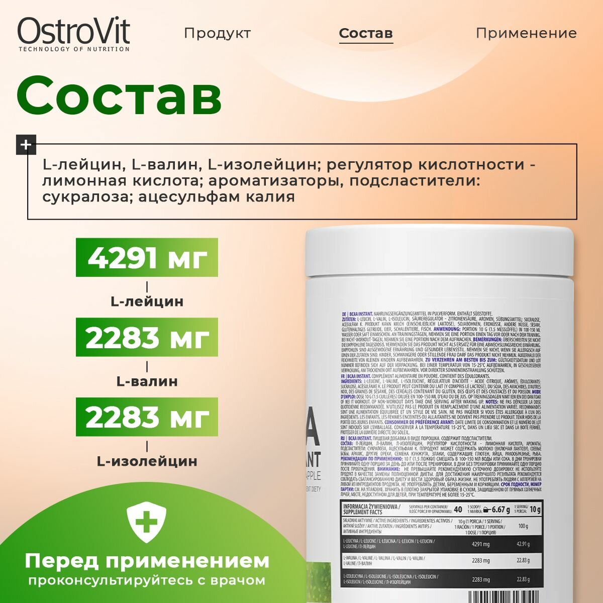 Аминокислоты Ostrovit Instant, BCAA 2-1-1, Спортивное питание, комплекс аминокислот для набора мышечной массы, для похудения, порошок 400г со вкусом зеленого яблока