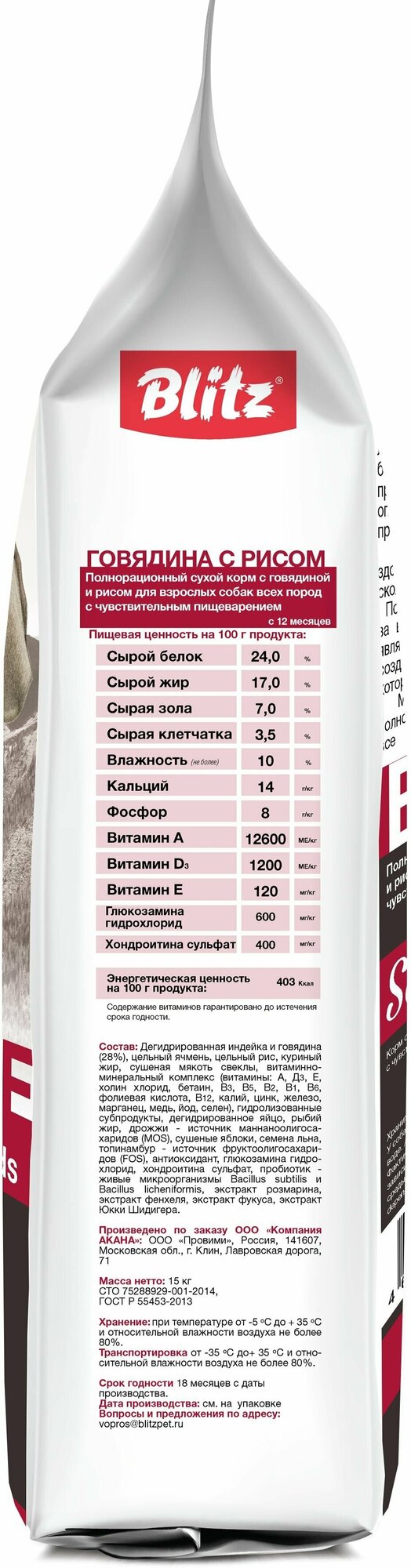 Сухой корм для собак Blitz при чувствительном пищеварении, говядина, с рисом 15 кг