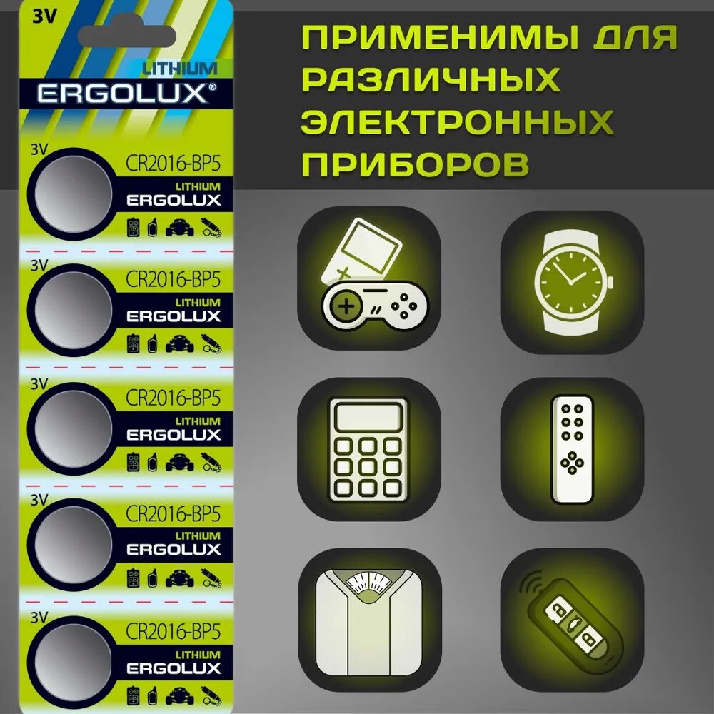 Батарейки литиевые Ergolux - тип CR2016, 3В, 5 шт. в упаковке