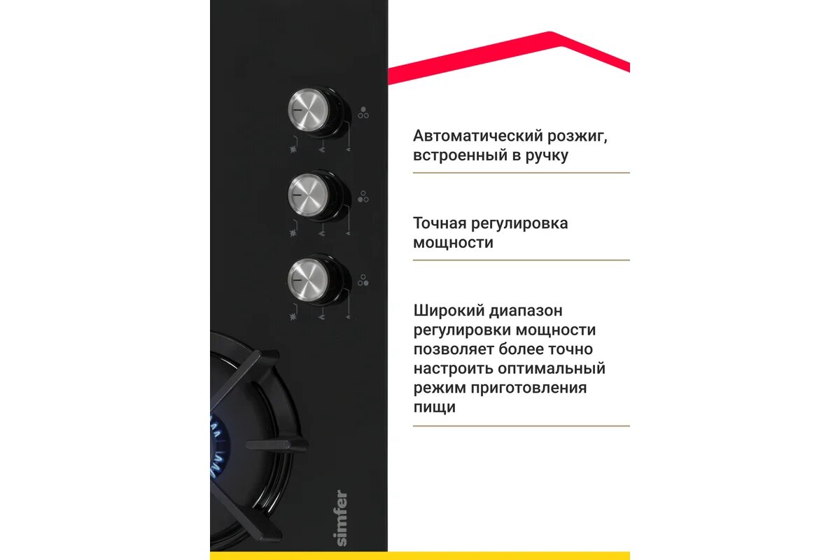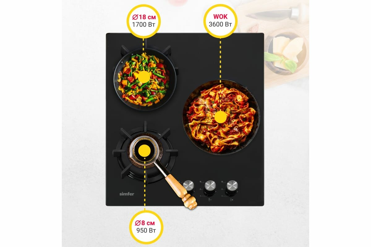 Варочные поверхности SImfer Газовая варочная поверхность, газ-контроль, WOK конфорка, черное стекло H45N35B571