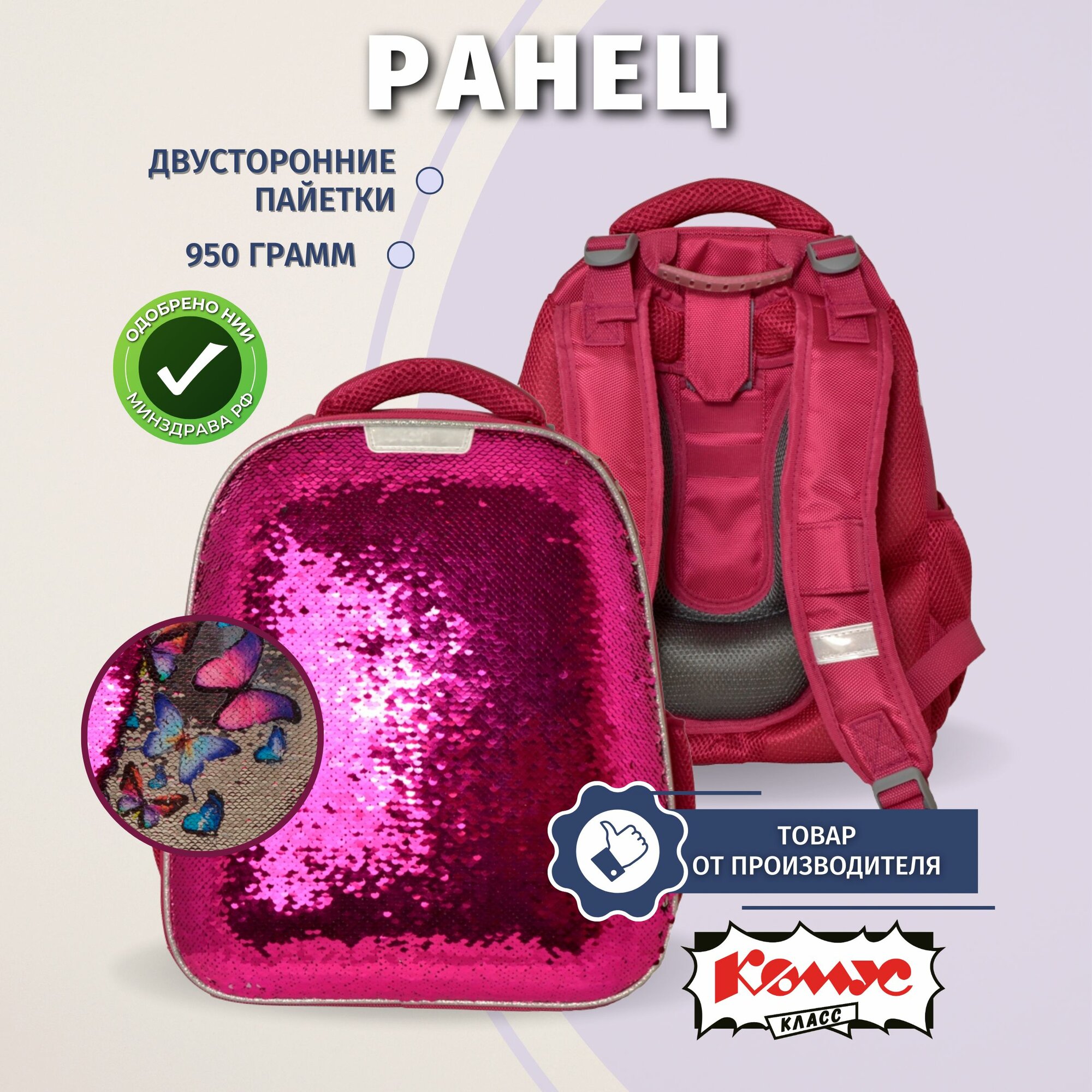 Школьный рюкзак (ранец) Ранец школьный Комус Класс Sparkle Pink, анатомический, 2 отделения, 4 кармана
