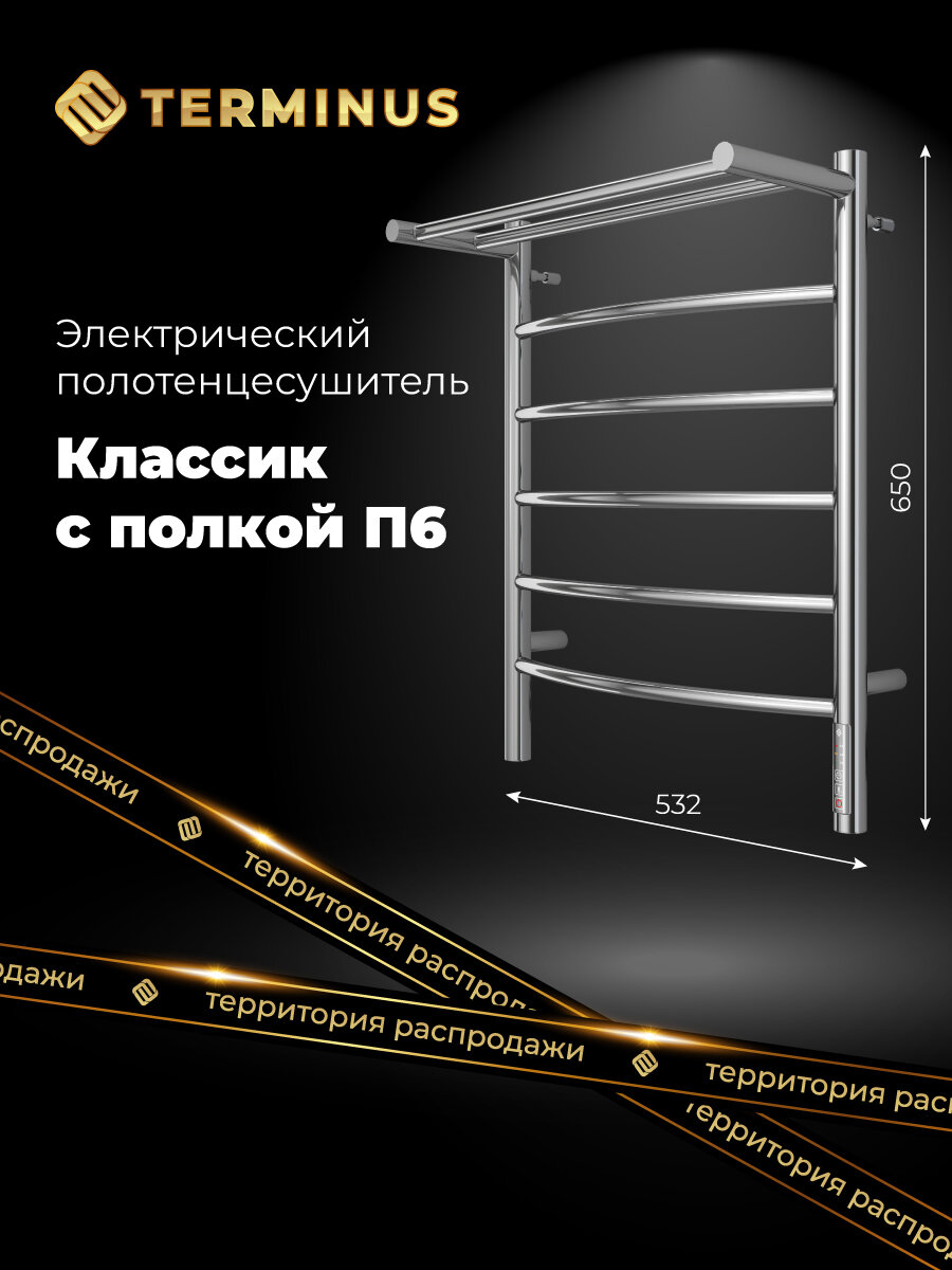 Полотенцесушители Полотенцесушитель электрический с полкой TERMINUS (Терминус) Классик с полкой П6 500х650 мм, нержавеющая сталь, гарантия 5 лет