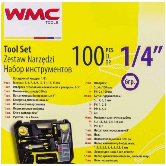 WMC TOOLS WMC-20100 Набор инструментов 100 предметов слесарно-монтажный 1/4" 6-ти гран. 4-44мм WMC TOOLS