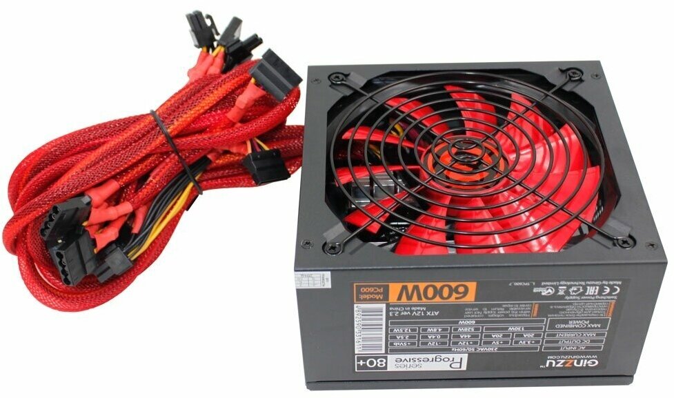 Блоки питания Блок питания Ginzzu PC600 14CM(Red) 80+ black,APFC,24+4p,2 PCI-E(6+2), 5*SATA, 4*IDE,оплетка, кабель питания,цветная коробка