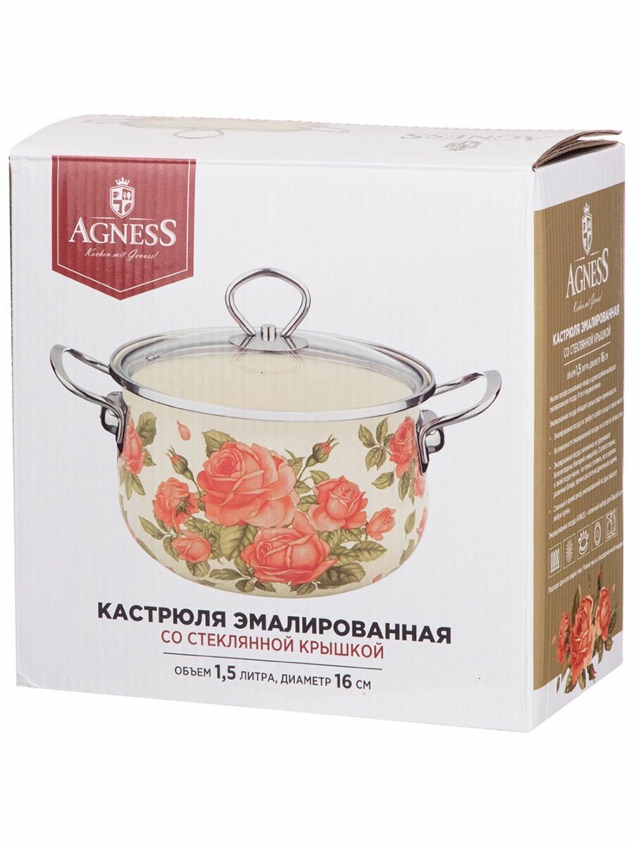 Кастрюли Кастрюля Agness эмалированная со стеклянной крышкой, серия "Корейская роза"1,5 л, 16х10 см