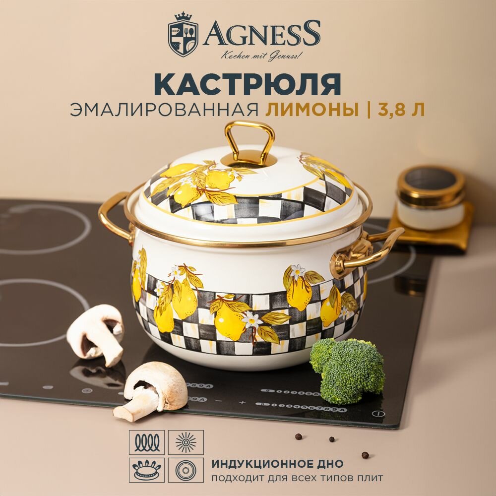 Кастрюля эмалированная AGNESS С крышкой, лимон 3,8Л, ДИА.20СМ подходит для индукцион.ПЛ