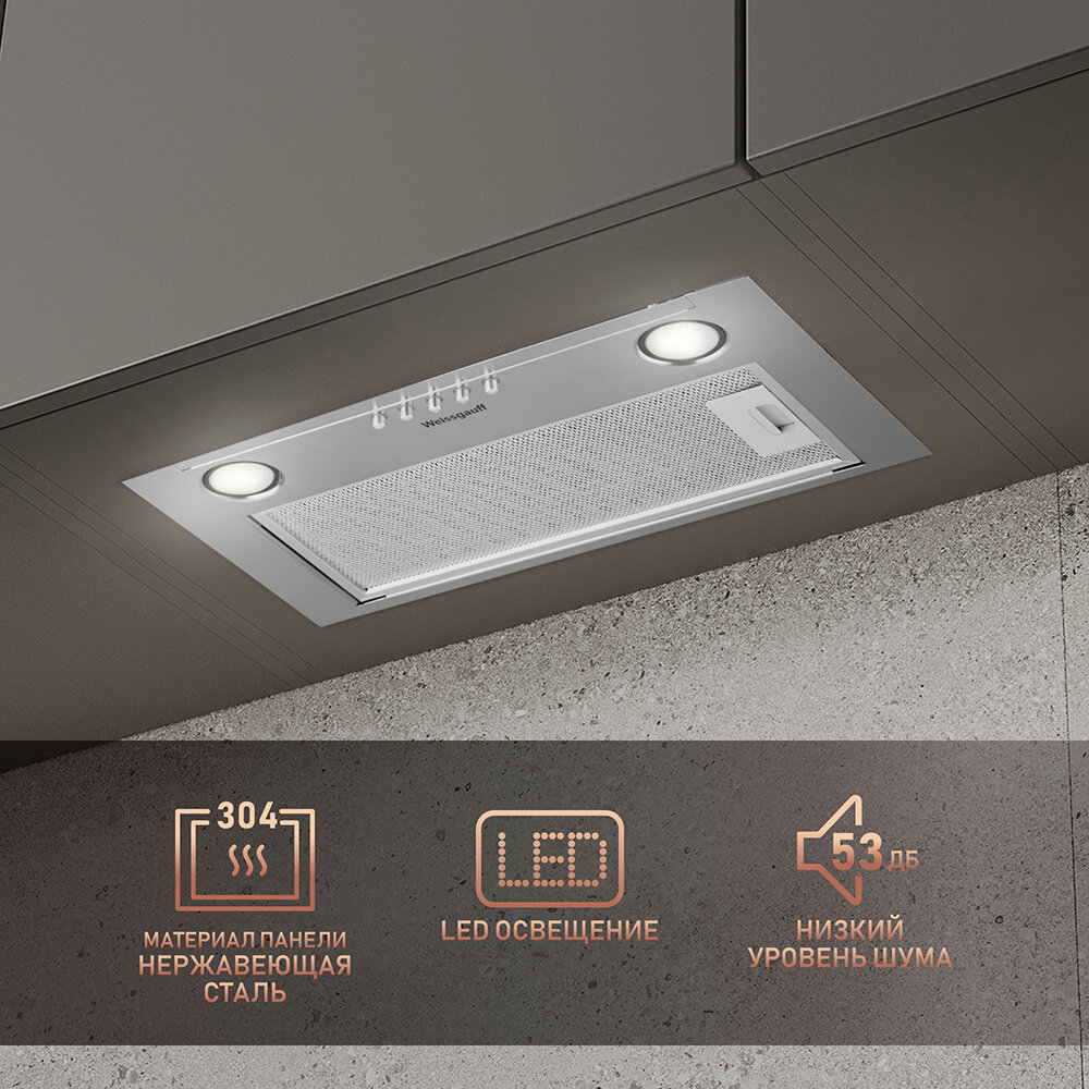 Вытяжки Кухонная встраиваемая вытяжка Weissgauff Alpha 45 PB IX, Алюминиевый жировой фильтр, Низкий уровень шума