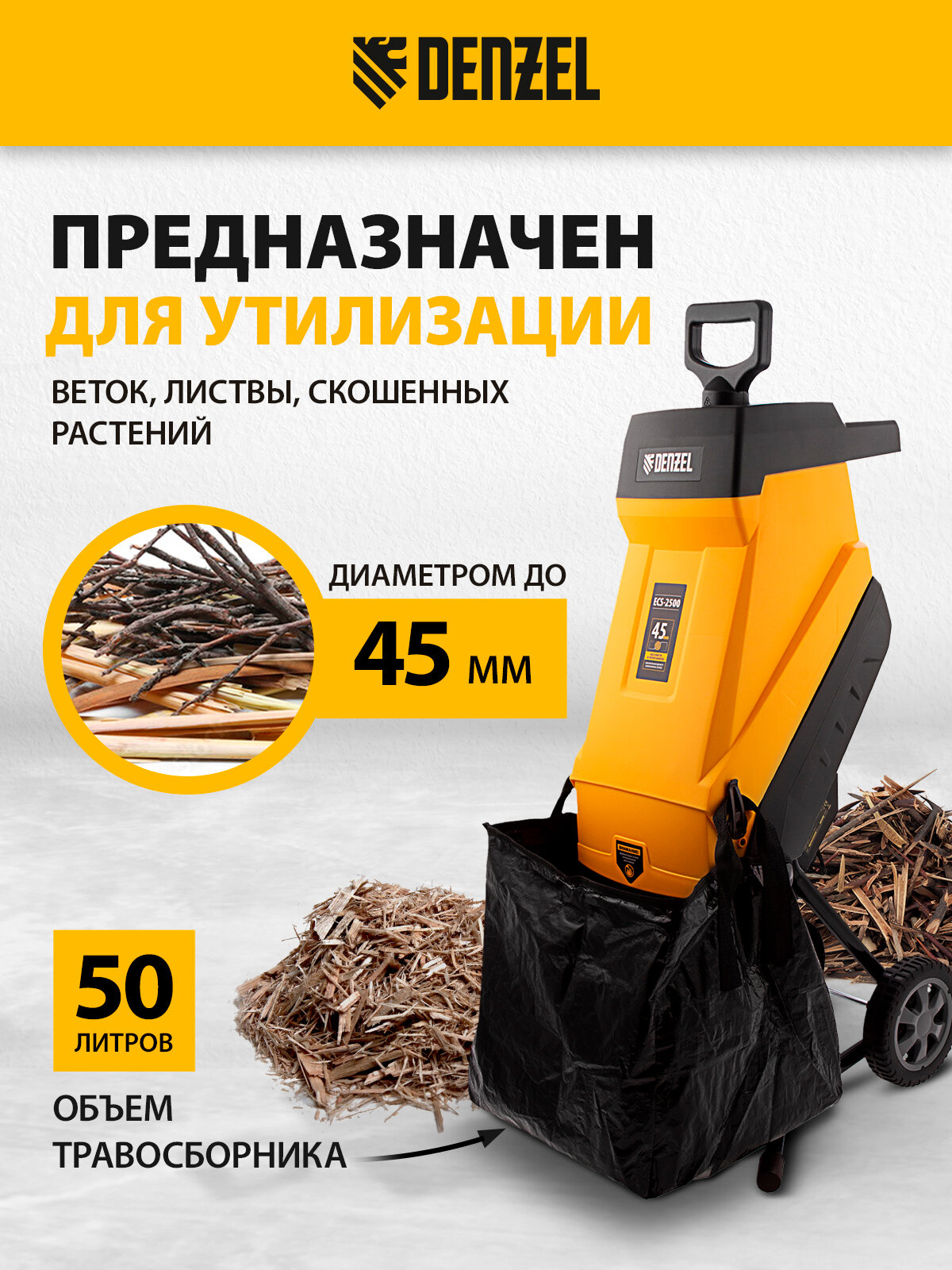 Измельчитель садовый электрический 59701 -ECS-2500, 2500 Вт, 45 мм Denzel