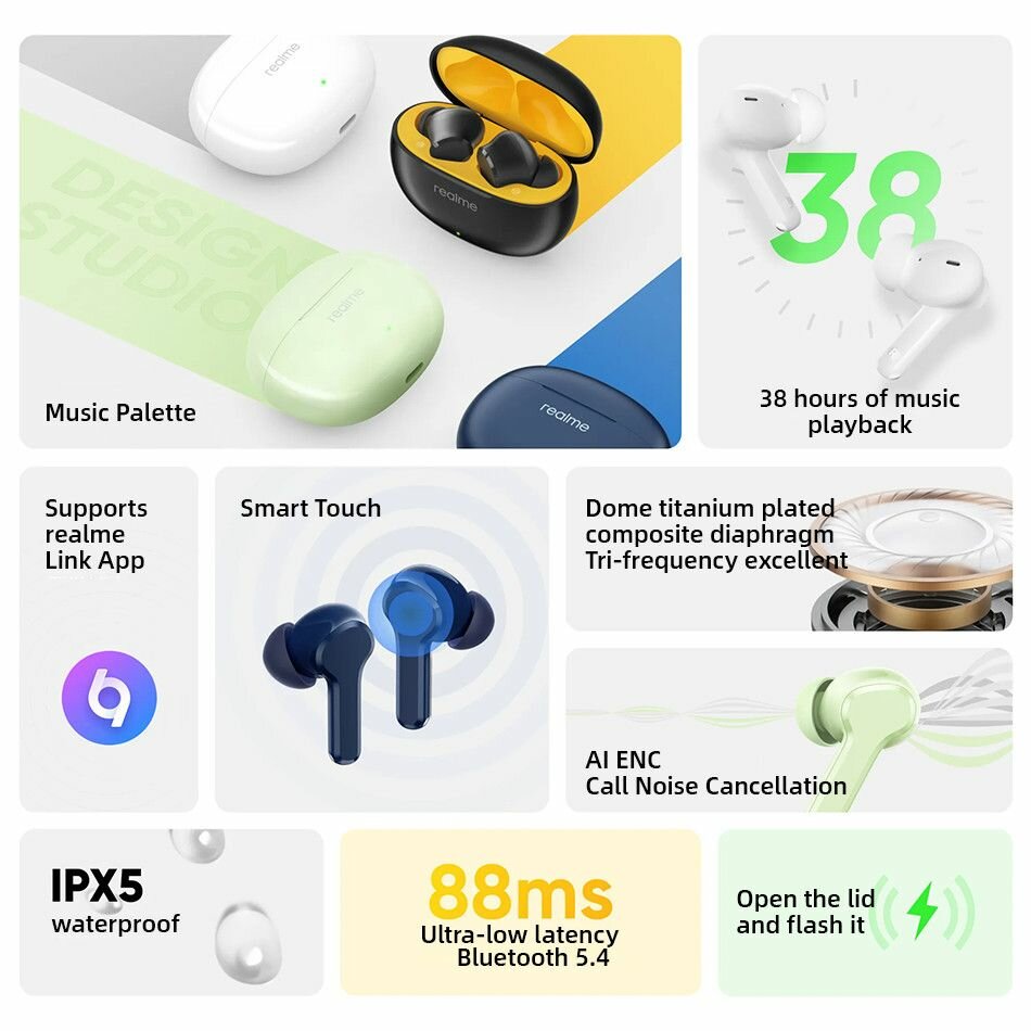 Наушники Наушники Realme Buds T110 TWS Bluetooth 5.4, Беспроводные наушники с функцией отмены чужих вызовов, 38 часов автономной работы, IPX5