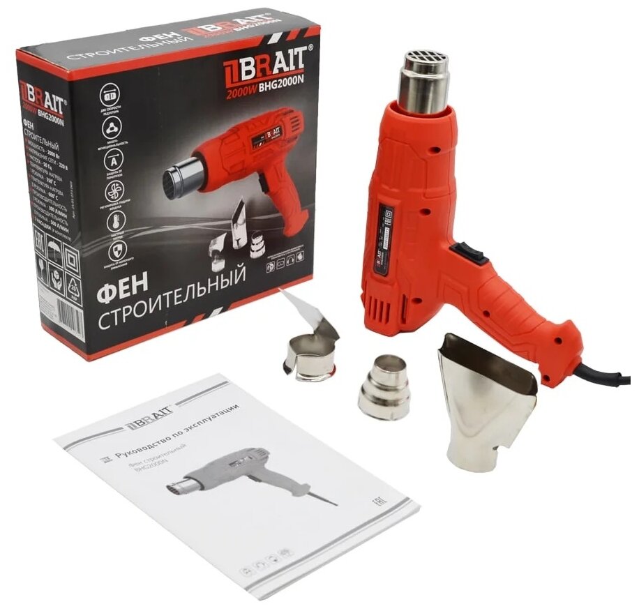 Фен технический BRAIT BHG2000N 2000 Вт, макс. темп. 485 С, 2 скорости, 3 насадки