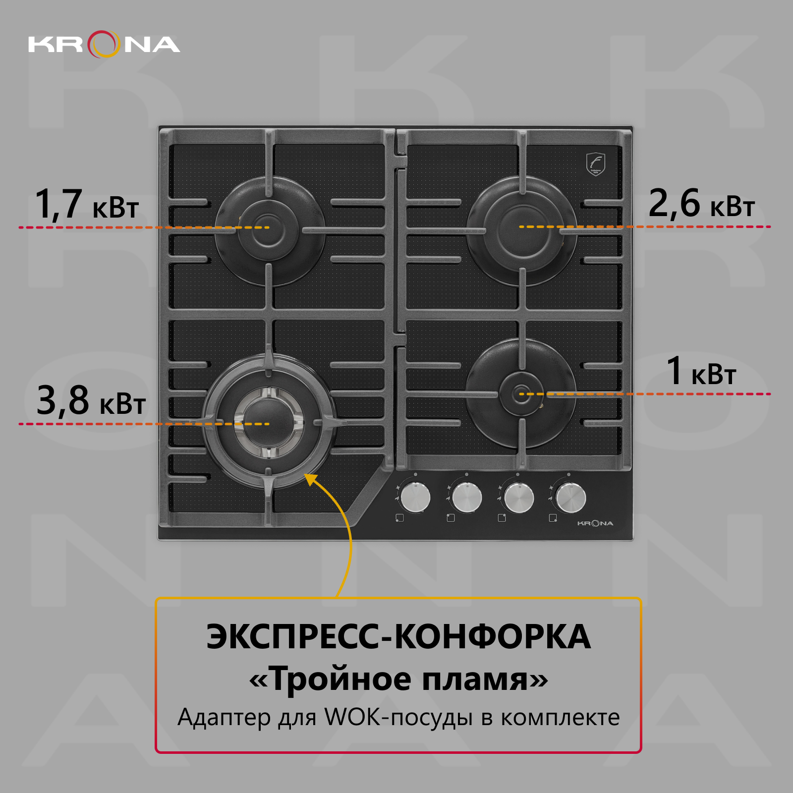 Поверхность газовая KRONA ARDENTE 60 BL черный (стекло, чугун, г/к, WOK)