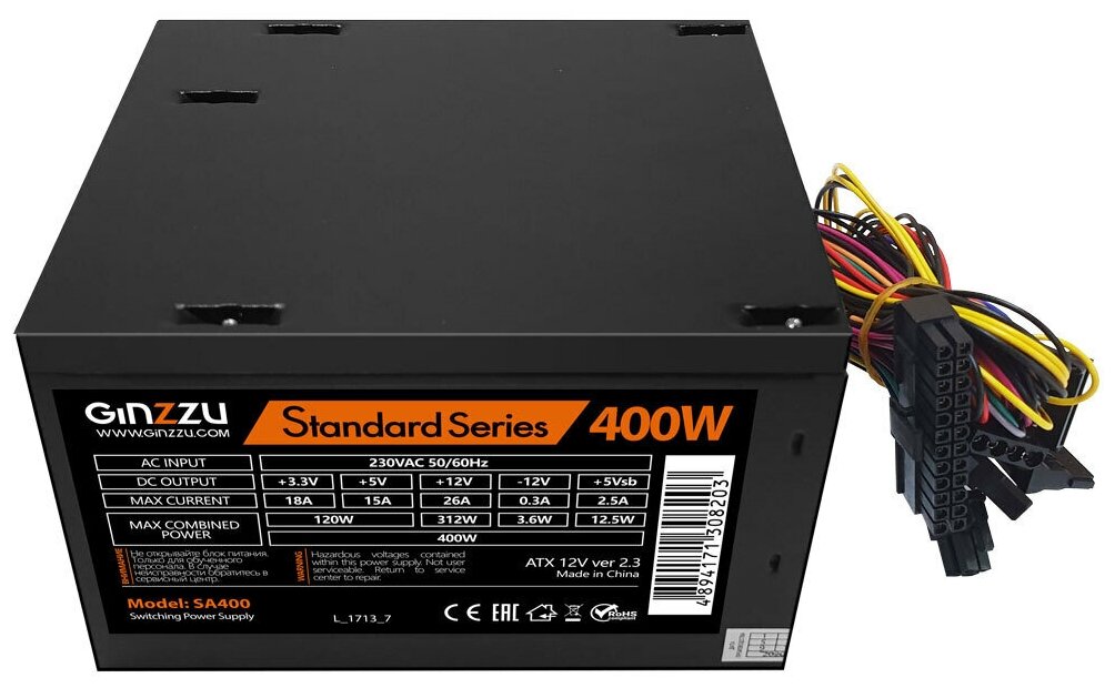 Блок питания 400 Вт ATX Ginzzu SA400, 80 мм (SA400 ОЕМ)
