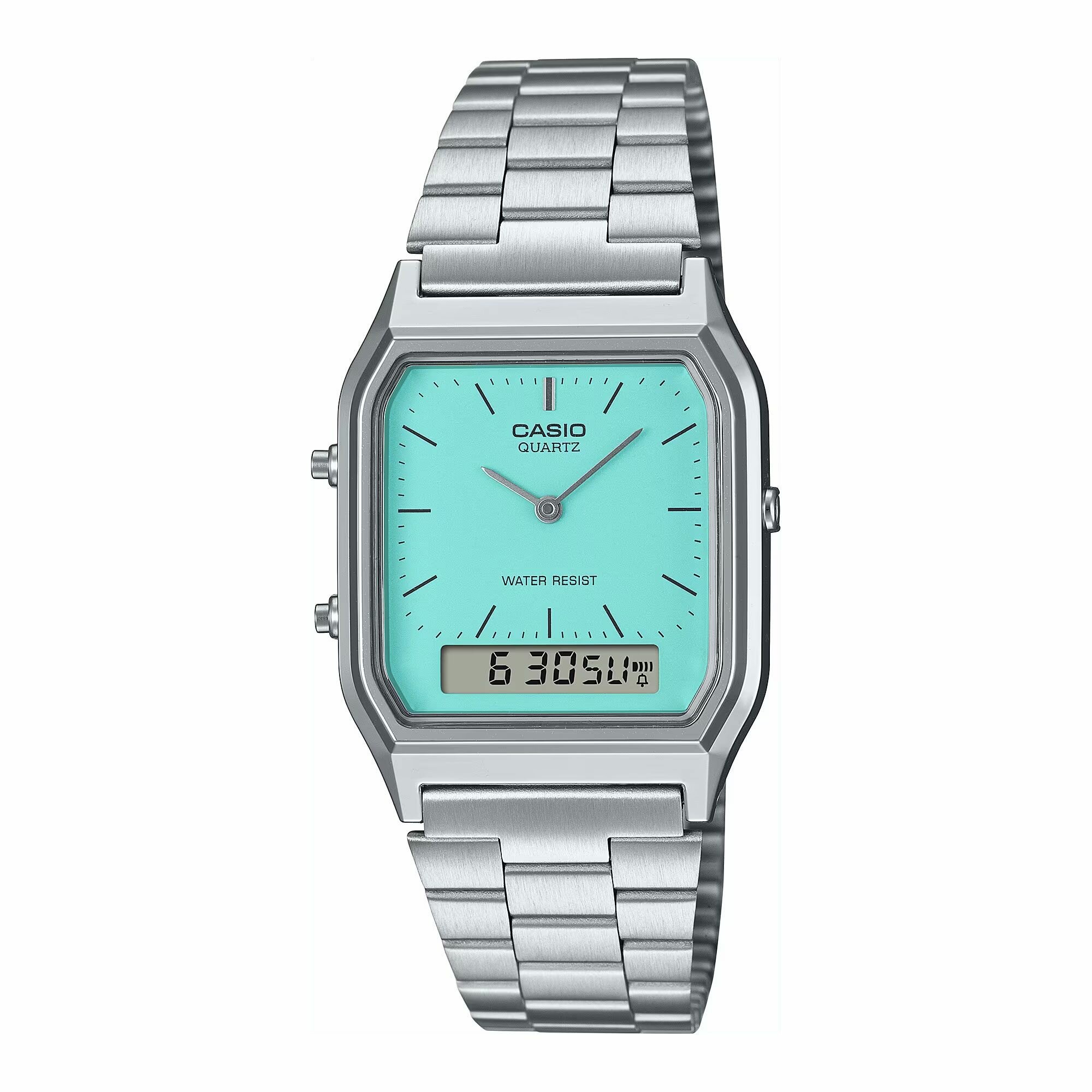 Наручные часы AQ-230A-2A2 Casio наручные часы кварцевые WR30 (3 атм) мужские, женские серебряный, бирюзовый секундомер будильник отображение числа, второй часовой пояс, отображение дня недели, отображение месяца акриловое стекло