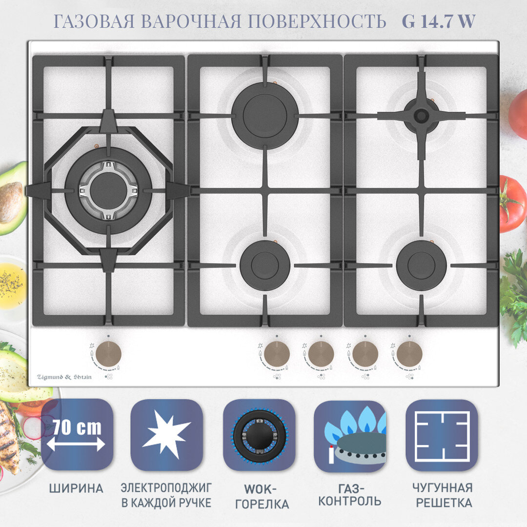 Варочная поверхность Варочная панель газовая Zigmund & Shtain G 14.7 W, 5 конфорок, 10800 Вт, белый