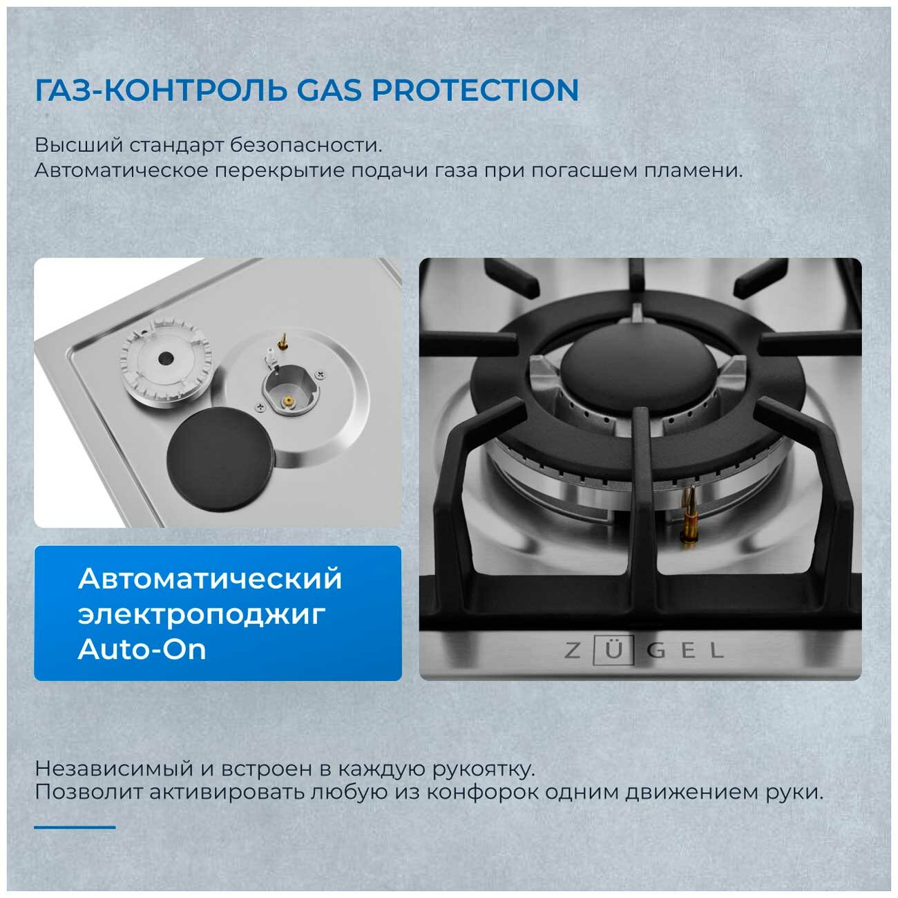 Варочная панель газовая ZUGEL ZGH601X, 60 см, газ-контроль, 8000 Вт, WOK-конфорка
