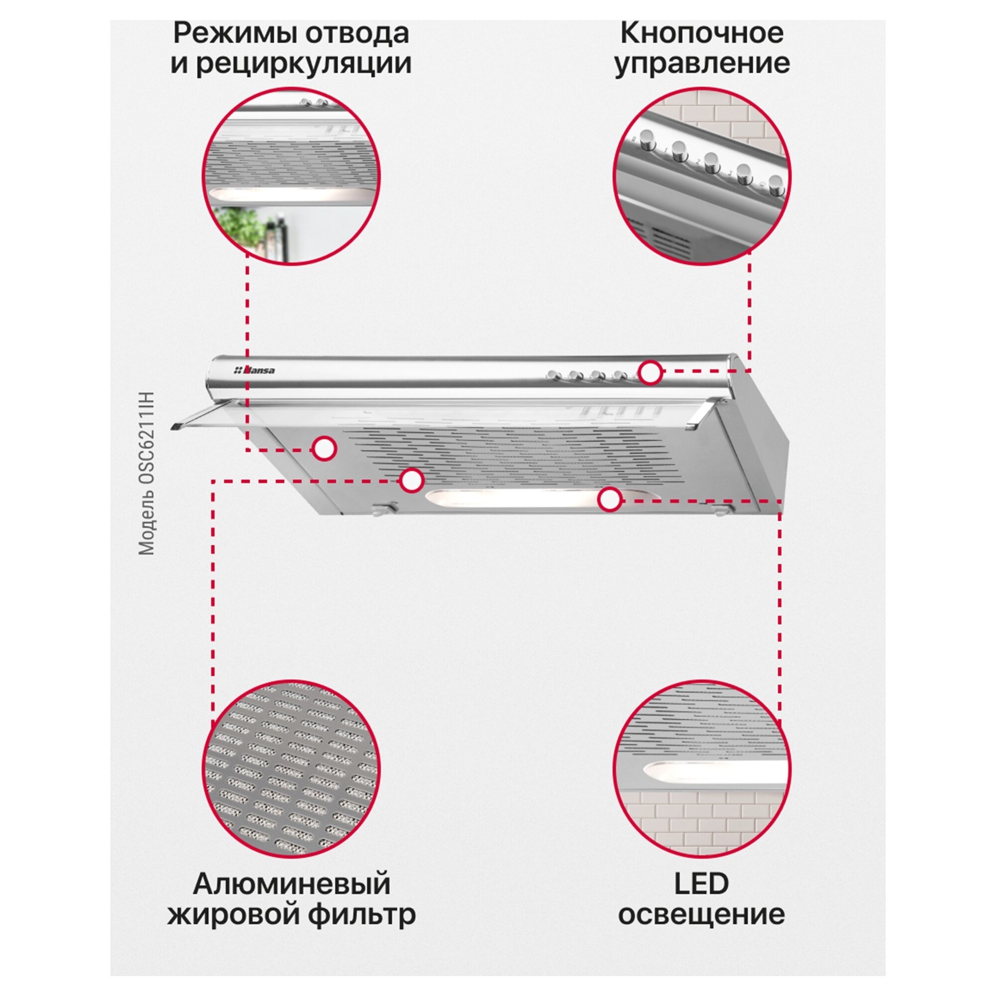 Вытяжка кухонная встраиваемая Hansa OSC6211IH, 60 см, 3 скорости, LED подсветка, алюминиевый жировой фильтр, механическое управление