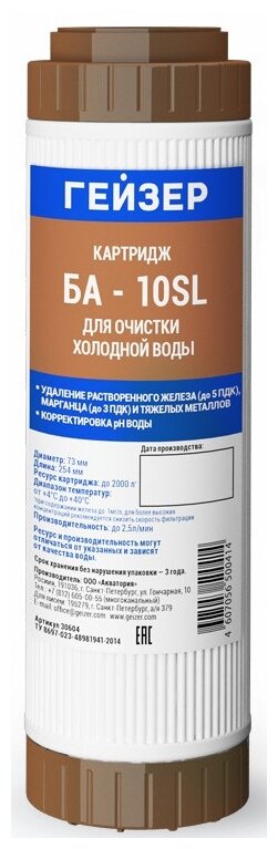 Картридж Гейзер БА 10SL, эффективная очистка воды от избыточного растворенного железа, достигает удаление до 1 мг/л, 30604 750 ₽ Подробнее
